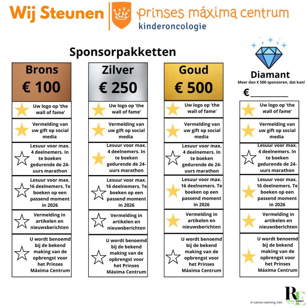 Wij hebben diverse sponsorpakketten samengesteld waarmee je als bedrijf echt het verschil kan maken. Je kan kiezen uit Brons, Zilver, Goud of Diamant en onderstaand hebben we overzichtelijk de inhoud van de pakketten weergegeven.